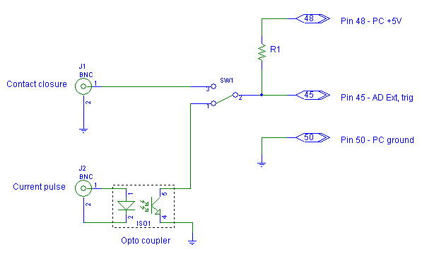 4. Linux driver for PCI-DAS1602-16 A/D cardThe Linux device driver for this data acquisition boards is written by Dr. Warren J. Jasper at North Carolina State University. These drivers are freely available via anonymous ftp from: ftp://lx10.tx.ncsu.edu/pub/Linux/drivers. They are also available from this server, click here. As of May 31, 2001 we use version 1.5. A listing of the terminal window during installation. 5. Trigger inputThe switch selects trigger type. "Current pulse" input is tailored to GeTech GUNCO "FTB recording" output where there is a resistor that acts as current limiter. IMPORTANT: Ensure current is limited (< 15 mA?) if other trigger source is used with this input.