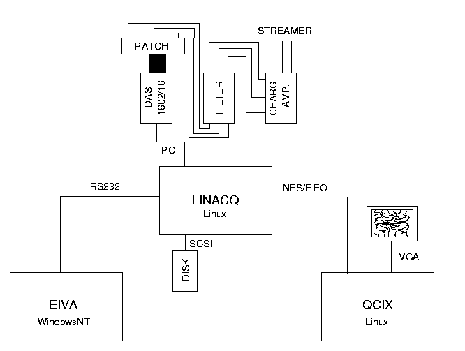 1. OverviewThe Linacq data recording system consists of the following parts: +------------------------------------+ | LinAcq PC | +------------------------------------+ | OS: Linux RedHat 6.1 | | CPU, RAM: PII, 466MHz, 128MB | | HD: SCSI, 18.2GB Fujitsu MAE3182LP | | CD-WR: Sony CRX-140s (SCSI) | | TAPE: Exabyte | +------------------------------------+ | A/D card (PCI): | | - 16-bit | | - 16 ch. single-ended, | | or 8 ch. differential. | +--------------------+ | Mod: PCI-DAS1602-16 | | Input panel | | Mfr: Measurement Computing +===========+ Signal & trigger | | (formerly ComputerBoards) | | BNC | +------------------------------------+ +--------------------+ Fig. 1. Linacq block diagram 2. PC HardwareMain PC
