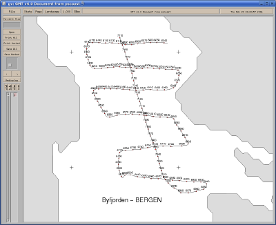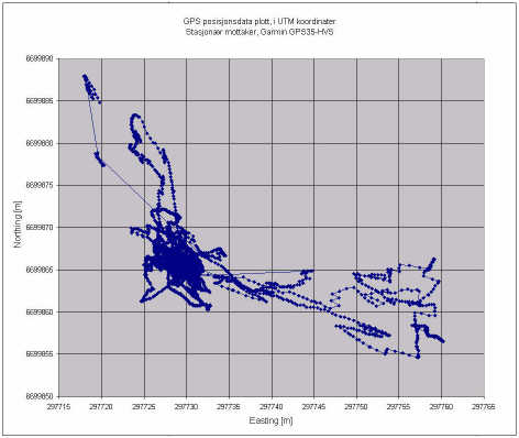 To get an idea of the GPS accuracy, here is a 3-hour position logging from a stationary GPS (click to enlarge). As you can see, the data outliers can be large. This is the reason for employing differential GPS - will use this on next RV "Hans Brattstom" survey. 3-hour positional plot from stationary GPS. 6. Software notesLatitude / Longitude to UTM conversion.The Garmin GPS-35 receiver can be configured to output a combination of different data telegrams, called NMEA sentences. In our case, we have selected the GPGGA sentence. The part og the GPGGA sentence that is included in the recording logfile has this format: $GPGGA,135902,6028.5914,N,00514.8399,E,1,09,0.8