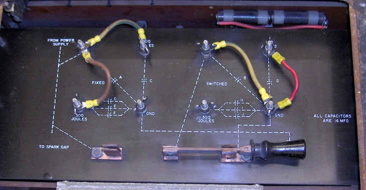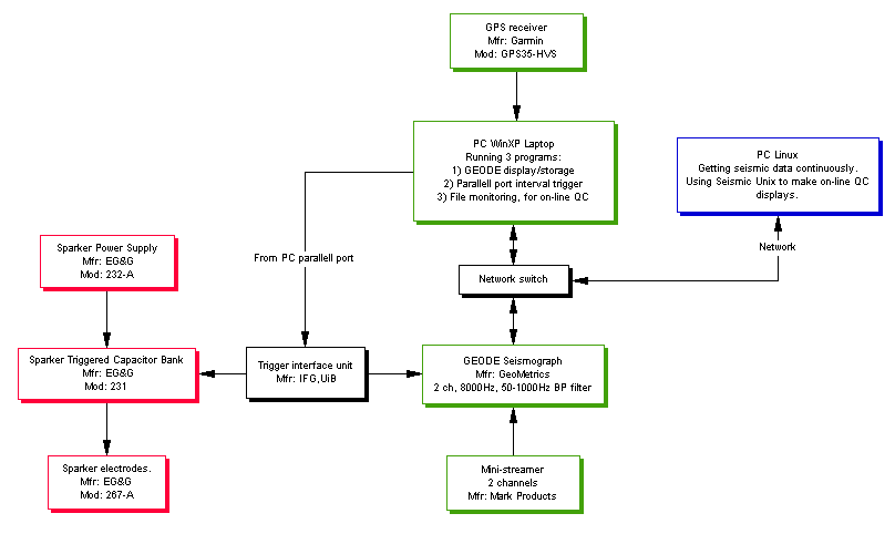 GEOL200-2006 instrumentation diagram. Sparker sourceThe sparker system stores energy in a bank of high-voltage capacitors, and discharges these through the sparker electrodes in the water when the system receives a trigger pulse.