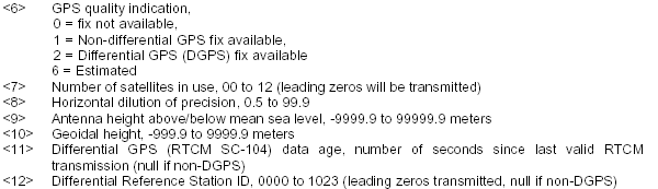| | | | | | +----------> GPS Quality Indicator 0 - fix not available, 1 - GPS fix, 2 - Differential GPS fix