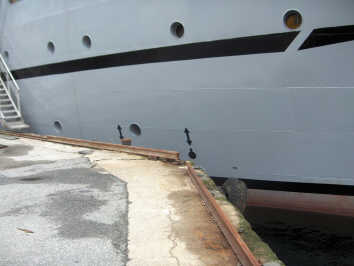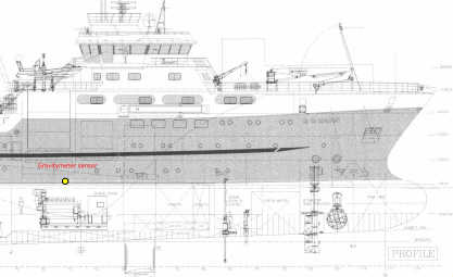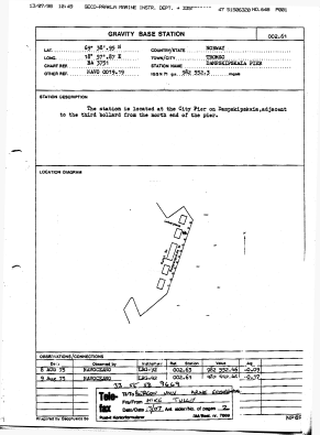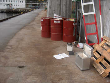 Table 2: Base reading Nykirkekaien 15 July 2005. The height from quay to sea surface (1.60 m) and distance from sea surface to gravitymeter sensor (0.4 m) means that gravitymeter in ship is 1.2 m lower then land gravitymeter. Position of land gravitymeter shown below: