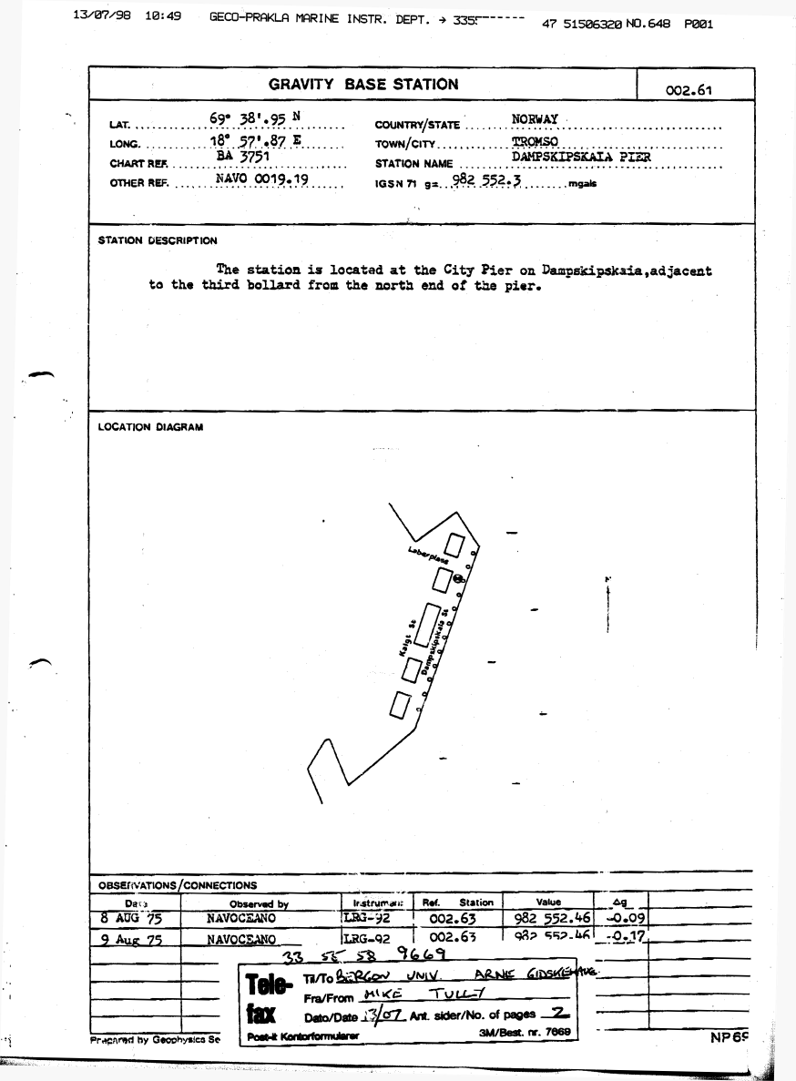 Table 4: Base reading Dampskipskaia, Tromsø 3 August 2005 Note 1) Estimation of distance from quay to sea surface Statens Kartverk (Norwegian Mapping Authority) very conveniently operates a tide level gauge at Dampskipskaia. From SVALEX-2004 gravity tie on the same location we know that the distance between quay and sea surface on 14. sep. 2004 at 10:27 local time was 3.0 meter. By comparing this tide level to the tide level on 3. aug. 2005 at 14:30 UTC, we can calculate distance between quay and sea surface on the latter date.