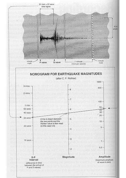 The Richter magnitude of an earthquake is determined by using two pieces of information from the seismogram record: the amplitude (heigh) of the largest wave, and the time between the P and S waves. The latest gives an estimate of the distance from the eartquake focus to the station. Then, a single line can be drawn across a chart called a nonograph(bottom). This line must go from the time value at the left column, to the amplitude value at right one. The Richter magnitude can be read off at the central column. Each instrument has its own nomograph chart because it has its own specific magnification of the Earth's movements caused by the seismic waves. |