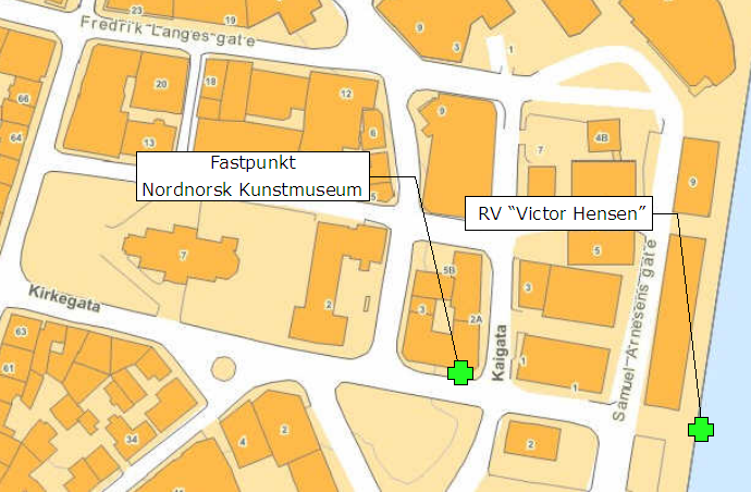 Gravimeteret var plassert ett dekk ned i forhold til arbeidsdekk. Hvis man regner 2.2 meter høydeforskjell mellom dekkene, og at landgravimeteret var 1 meter over arbeidsdekket, skulle det i dette tilfelle bli (2.2 + 1.0) - 0.4 = 2.8 meter avstand mellom sensor S-38 og landgravimeter (0.4 er regnet som avstand mellom sensor S-38 og dekket den var montert på).