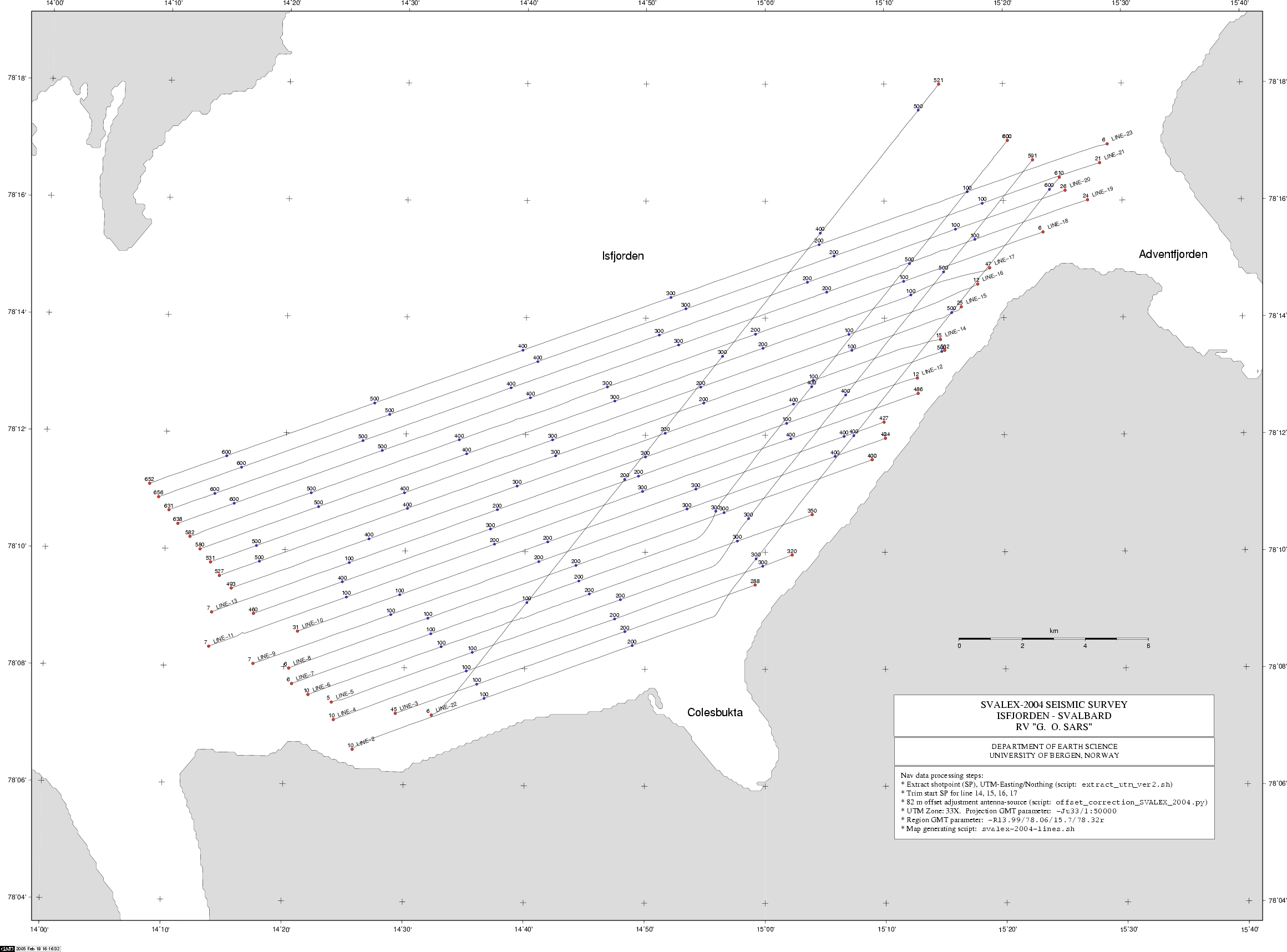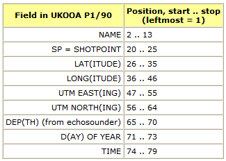 UKOOA P1/90 NAVIGATION DATADownload the UKOOA P1/90 format specification. It's a fixed-position format without any <SPACE> or <TAB> separators between fields, so it can be hard to read. However, by inserting appropriate comment field in the header, it can be made much more legible, as this example shows: H0100 SURVEY AREA ISFJORDEN, SVALBARD H0101 SURVEY DETAILS SVALEX-2005 H0102 VESSEL DETAILS R.V. HAAKON MOSBY H0104 STREAMER DETAILS 240 CH GECO NESSIE-3 H0200 SURVEY DATE AUGUST - SEPTEMBER 2005 H0201 FILE CREATED 16-Jan-2006 H0202 FILE VERSION UKOOA P1/1990 H0300 CLIENT SVALEX-2005 H0400 GEOPHYSICAL CONTRACTOR UNIVERSITY OF BERGEN, NORWAY H0500 POSITIONING CONTRACTOR N/A H0600 POSITIONING PROCESSING O.M. UNIVERSITY OF BERGEN, DEPT OF EARTH SCIENCE H0700 POSITIONING SYSTEM H0700 SURVEY COMPUTER SOFTWARE NAVIPAC, EIVA, DENMARK H0700 H0800 SHOTPOINT POSITION CENTRE OF SOURCE H1000 CLOCK TIME UTC H0900 OFFSET SHIP SYSTEM TO SP 70.0 M BEHIND H1200 SPHEROID AS SURVEYED A,1/F WGS-84 Spheroid 6378137.000 298.2572236 H1300 SPHEROID AS PLOTTED A,1/F WGS-84 Spheroid 6378137.000 298.2572236 H1400 GEODETIC DATUM AS SURVEYED WGS-84 H1500 GEODETIC DATUM AS PLOTTED WGS-84 H1700 VERTICAL DATUM SL : ECHO SOUNDER H1800 PROJECTION 001 UTM NORTHERN HEMISPHERE H1900 ZONE 33X NORTHERN HEMISPHERE H2000 GRID UNIT 1 METRE H2001 HEIGHT UNIT 1 METRE H2002 ANGULAR UNITS 1 DEGREES H2200 CENTRAL MERIDIAN 15 DEG E H2600 H2600 00011111111112222222222333333333344444444445555555555666666666677777777778 H2600 78901234567890123456789012345678901234567890123456789012345678901234567890 H2600 -NAME-><->---<-SP-><---LAT--><--LONG---><--EAST-><-NORTH-><-DEP><D><TIME>- SLine34-05 18781022.23N 141348.31E 482384.58677774.7 215.8242180734 SLine34-05 19781023.47N 141353.32E 482416.98677812.8 214.7242180755 SLine34-05 20781024.73N 141358.24E 482448.78677851.4 212.3242180816 SLine34-05 21781026.00N 1414 3.08E 482480.08677890.4 209.6242180837 SLine34-05 22781027.28N 1414 7.88E 482510.98677929.7 207.6242180858 SLine34-05 23781028.53N 141412.83E 482543.08677968.1 206.2242180919 The lines starting with H2600 are just comments. You will notice that: ![]() Degrees (D), Minutes (M) and Seconds (S) of Latitude/longitude as given as (D)DDMMSS.SS. Notice the longitudes marked like this: 1414 3.08E. Here we have 3.08 seconds, and the leftmost field is simply vacant; the same applies to the Minute and Degree fields, should they only need one digit. GPS NMEAWe are presented with a data file, gps.dat, containing three NMEA telegrams, $GPRMC, $GPGGA, $GPVTG, for each position: $GPRMC,103409,A,6028.3420,N,00519.9763,E,000.0,000.0,040805,002.4,W*6B $GPGGA,103409,6028.3420,N,00519.9763,E,1,10,0.8,106.9,M,43.9,M,,*4B $GPVTG,000.0,T,002.4,M,000.0,N,0000.0,K*78 $GPRMC,103410,A,6028.3420,N,00519.9763,E,000.0,000.0,040805,002.4,W*63 $GPGGA,103410,6028.3420,N,00519.9763,E,1,10,0.8,106.9,M,43.9,M,,*43 $GPVTG,000.0,T,002.4,M,000.0,N,0000.0,K*78 How are we to extract latitude and longitude, and convert the NMEA position format (D)DDMM.MMMM to decimal degrees? There are, of course, different approaches. Here we use awk to select lat/long from GPRMC telegrams: cat gps.dat | awk -F ',' '/GPRMC/ {print $4, $5, $6, $7}' > gps.dat.latlong