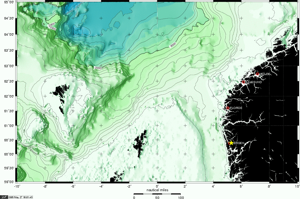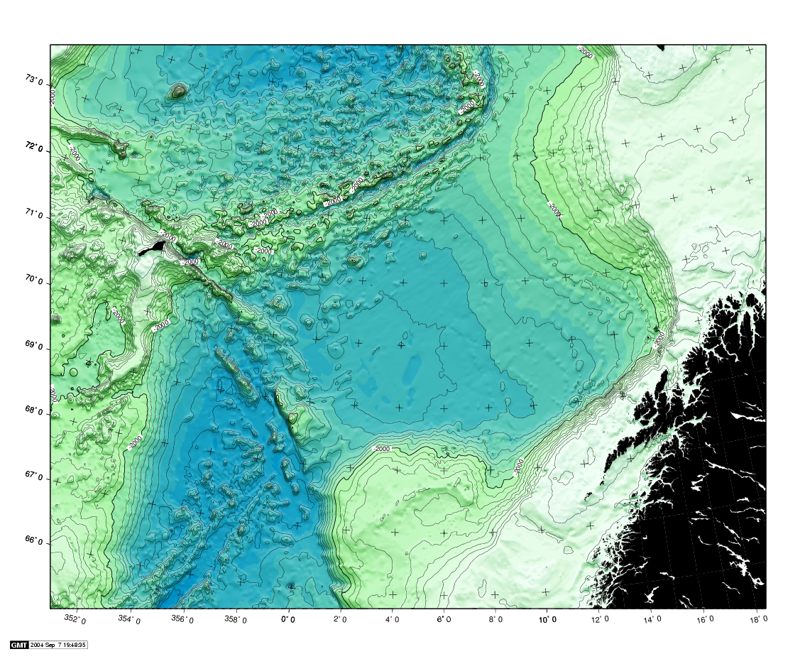Bathymetry: 5 arc-minute ETOPO 5 grid5 arc-minute ETOPO 5 grid, which is good for regional maps, but lacks resolution compared to the IBCAO data-set. (This grid file was not installed from a primary source, but from the Dept. of Geology, University of Oslo). File: /gmtdata/bathym/etopo-5/topo_world.grd