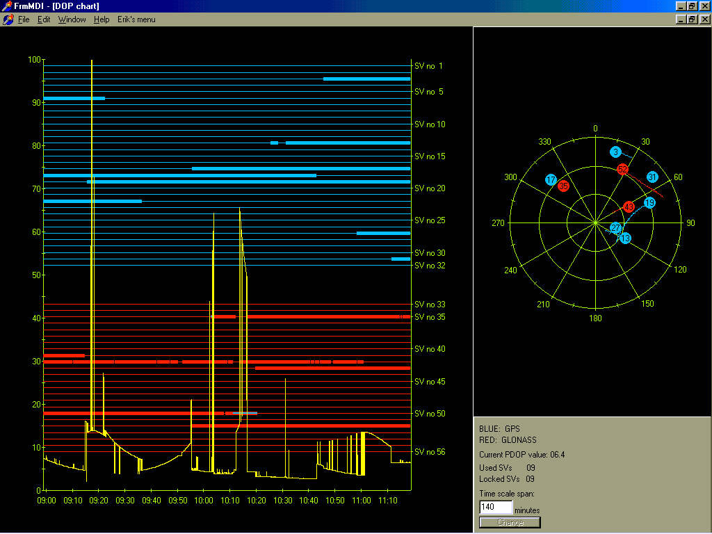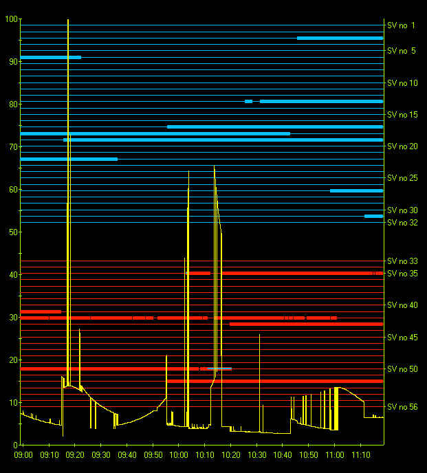Formålet med de to modulene er å bruke den første dersom det er differensielt korreksjonssignal tilgjengelig, og å bytte til den kombinerte GPS / GLONASS-mottakeren når korreksjonssignalet forsvinner - f.eks. i områdene omkring Svalbard, der IFJ har toktaktivitet. Vi har imidlertid observert uregelmessigheter i posisjoneringen når man er utenfor differensiell dekning og kun benytter den kombinerte GPS / GLONASS-enheten. En av lærlingene utviklet derfor et program for bedre å kunne overvåke kvaliteteten på posisjonsdataene. Programmet fremstiller to typer plott. Det ene er et tidsplott av GPS / GLONASS- mottakerens HDOP1 verdi samt hvilke satellitter (angitt ved SV2-numre) som til enhver tid benyttes i posisjoneringsalgoritmen. Hensikten er her å vise sammenhengen mellom dårlig HDOP-verdi og aktuell satellitt konstellasjon. Det andre plottet er et såkalt "skychart" som indikerer både retning og vinkel til hver benyttet satellitt. Så lenge signalet er sterkt nok vil satellittens bane bli vist som en kurve. Lar man slike banekurver akkumuleres over tid vil det muligens fremtre soner som har lavere kurvetetthet enn øvrige områder. Dette kan indikere en uheldig antenneplassering - f.eks. i radioskyggen av en maststruktur, eller i refleksjonssoner som fartøyets metalloverflater danner. Det forutsettes selvsagt at båten følger samme kurs så lenge datainnsamlingen varer. En annen faktor som kan påvirke navigasjonsutstyret er forstyrrelser fra båtens Inmarsat terminal. Produsenten av GPS / GLONASS-mottakeren opplyser at det kan oppstå "jamming" dersom GPS / GLONASS antennen befinner seg nærmere enn 50 fot fra Inmarsat antennen. De uregelmessighetene vi opprinnelig observerte hadde imidlertid ikke den "av-på" karakteristikken som trolig er typisk for en Inmarsat "jamming" - det var mer tale om en gradvis forringelse av posisjonskvalitet, og deretter en gradvis forbedring. Denne karakteristikken er analog til den periodevise reduksjonen i HDOP kvalitet, som følge av uheldige banekonstellasjoner for de satellittene som ble benyttet. Noter: 1) HDOP: Horizontal Dilution of Precision. Den inverse av volumet av det romlegeme som fremkommer ved å trekke linjer fra mottakeren til de anvendte satellitter. Verdien bør være mindre enn 6. 2) SV: Space Vehicle, nummerering av satellitter. GPS fra 1 til 32, GLONASS fra 33 til 56. Fig. 1. HDOP (venstre akse, gul kurve) og anvendt SV (høyre akse, blå og rød kurve) som funksjon av tid. Ashtech GG24 mottaker. Forklaringer: