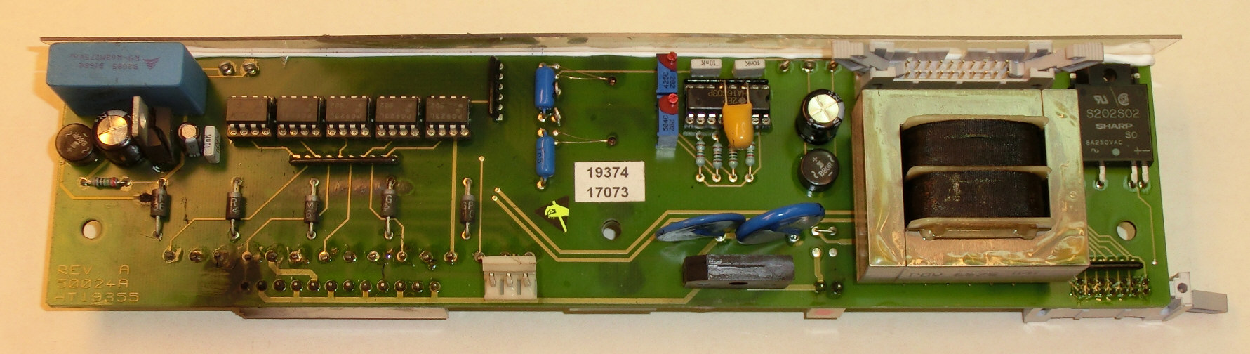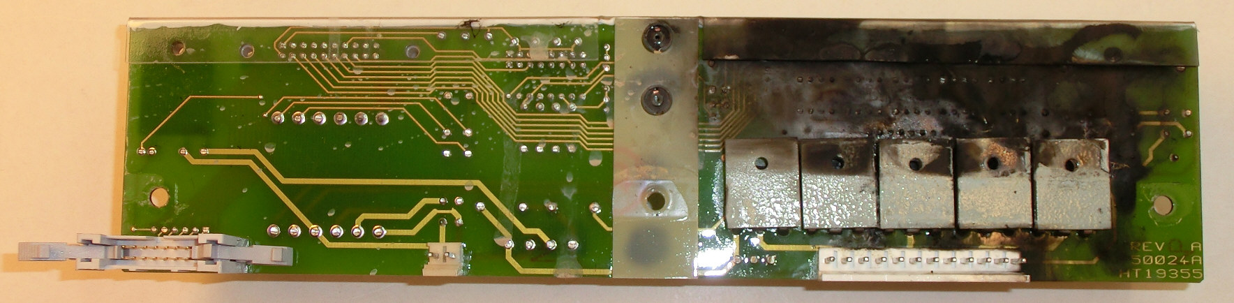 ![]() PCB NO. HT 19355, 50024A , REV. AMotor driver components overheated. Via hole on PCB burnt => some traces on the PCB might be damaged. PCB NO. HT 19355, 50024A , REV. A -- Click to enlarge. PCB NO. HT 19355, 50024A , REV. A -- Click to enlarge. MeasurementsMeasured motor windings on 12-way connector:
