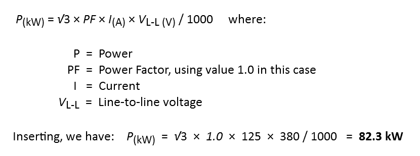 There is 3-phase outlet, 380 V, 50 Hz, 125 A max, on shelter deck. The amount of power available is given by the following expression: