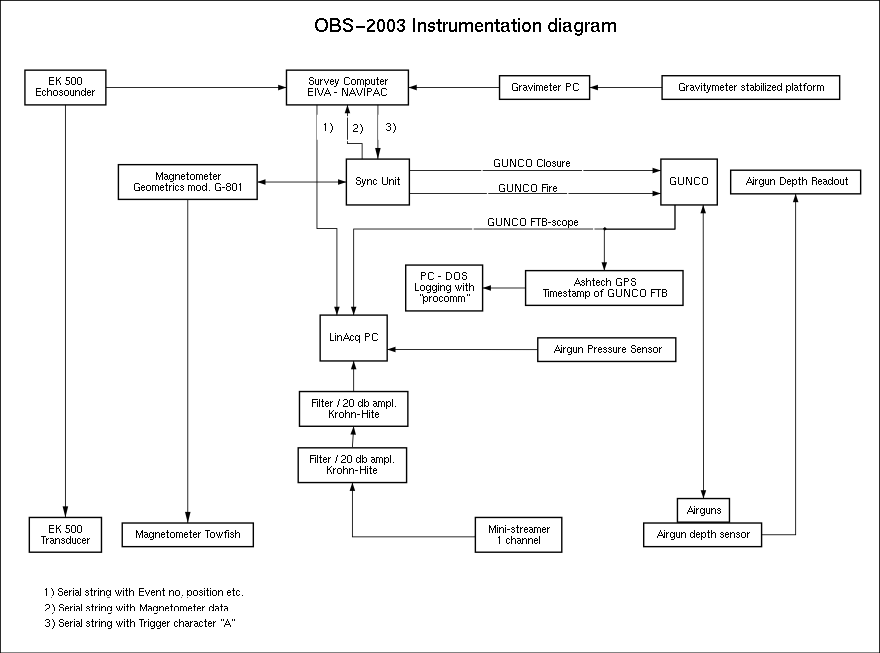 INSTRUMENTATIONBlock diagram![]() Fig. 1. OBS-2003 Survey Instrumentation block diagram. Airgun source layout, signature, spectrumClick image below to download pdf version. ![]() Fig 2: Airgun source layout, signature, spectrum. Click to download pdf version. Software used: NUCLEUS, by PGS.