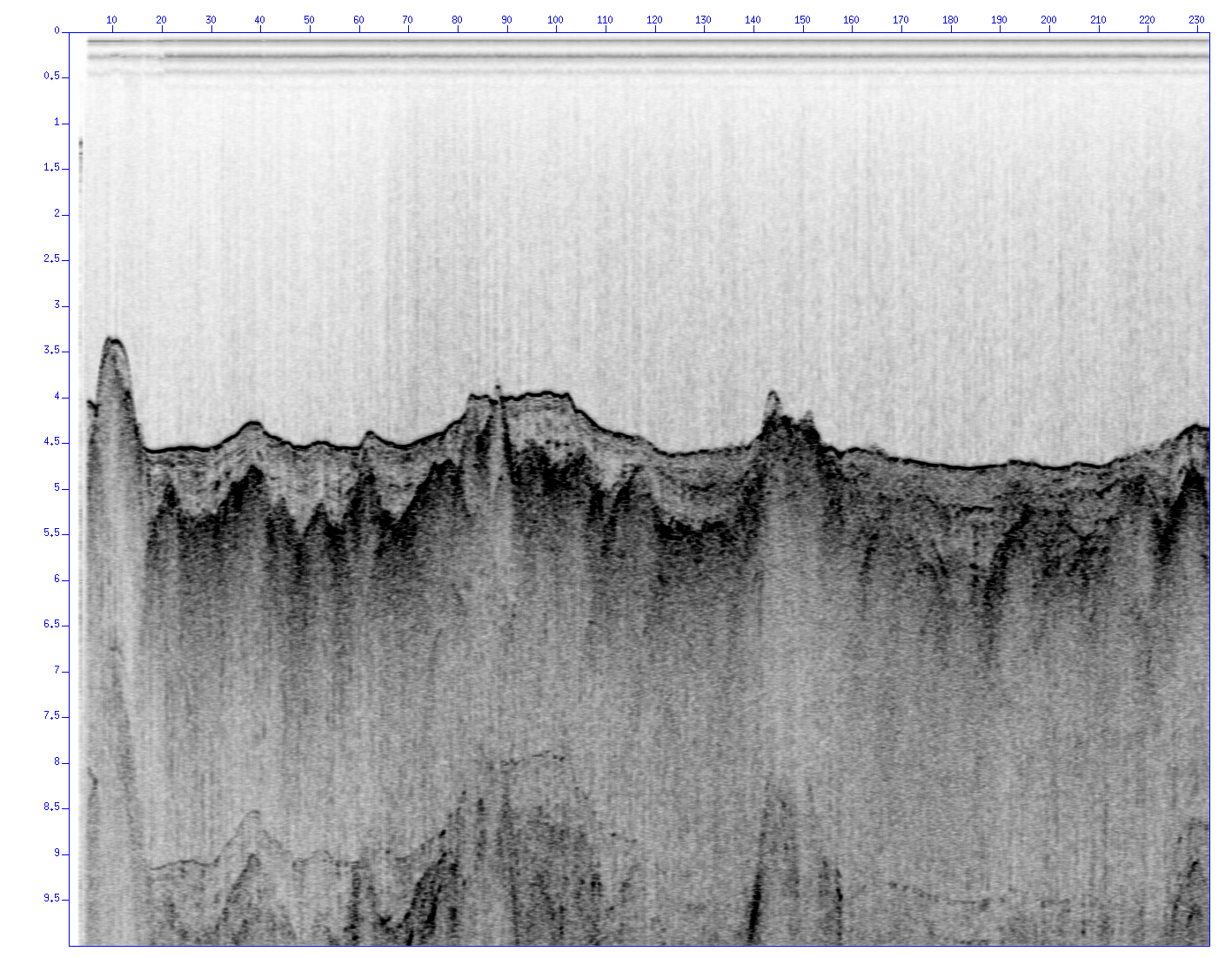 MINI-STREAMER DATACredits B.O. Ruud (GEO) for assistance in mini-streamer data handling: Processing steps in Seismic Unix: segyread tape=1535.sgy endian=0 | sugain tpow=1 | \ sufilter f=15,30,60,90 | suattributes | suop op=ssqrt | \ sustack key=fldr | sumix mix=1,2.2,2,2,1 | suximage perc=99 d2=0.2 & Suggestion by A.B.. Use Click to enlage: