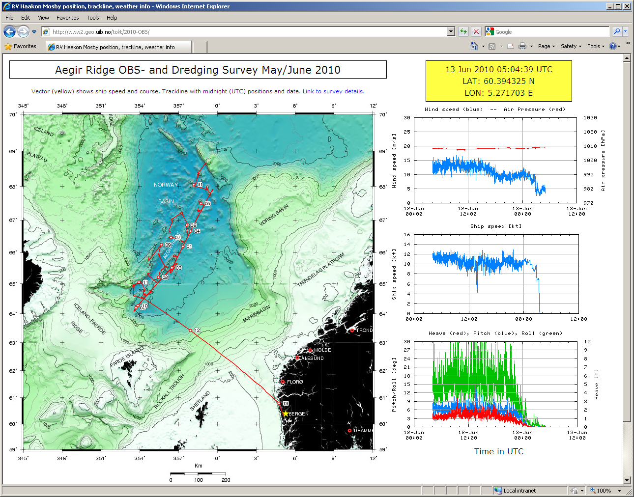 Distance to sea surface: 2.45 m Gravitymeter still reading: Day, time DG ST CC RAW TC 164:07:12:50 9155.5 9155.5 .0 -31 .0 K-check, 13 June 2010ST OFF Slew ST +30.0, wait > 5 min. -> TC = -28.5 Slew ST -60.0, wait > 5 min. -> TC = 28.7 Slew ST +30.0, wait > 5 min. -> TC = 0.0 ST ON MARINE OPERATING SYSTEM: 2.04 FOR METER S-38 Calibration table land gravity meter:Gravity reference "REALFAGBYGGET, BERGEN"Data format, hard disk logging gravity PC