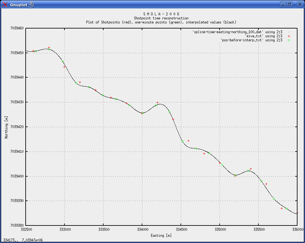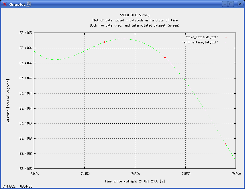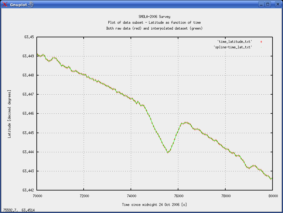 METHOD A: INTERPOLATION OF TIME/POSITION VALUESTwo stages are needed. First interpolated values must be calculated. Then shotpoint positions must be tied to nearest interpolated position. Interpolation stageWe here employ a spline type of interpolation. Using the GNU spline command (on a Linux machine) results in an interpolated data set with user defined resolution. Our Time/Easting and Time/Northing files contains 1340 lines of 1-minute positions. To obtain 100x interpolation use -n 134000 option, and -n 134000 for 1000x interpolation. Command line example, on Linux machine: cat time_latitude.txt | spline -n 134000 -P 12 > spline-time_lat.txt Ensure that the number of significant digits in the calculations are sufficient (the -P option). As an illustration of how the spline interpolation works, figure 2 shows plot of latitude versus time. The 1-minute input values from the Survey logger are shown as red crosses, while the interpolated data pairs are green dots. The high interpolated data density (100 points between two original data pairs) makes them appear as a continuous line. Figure 3 zooms in on a section of the curve, making the individual interpolated data points visible. Figure 2 shows a small irregularity in the seismic line positioning. This is not uncommon, and was merely selected to show how the interpolation could cope. ![]() Fig. 2: Plot of latitude versus time. Original 1-minute data pairs as red crosses; interpolated data as green points. ![]() Fig. 3: Detail from figure 2. Individual interpolation points are now visible. We tried two different sizes of interpolation steps - both 100x and 1000x, to see how step size influenced the result.