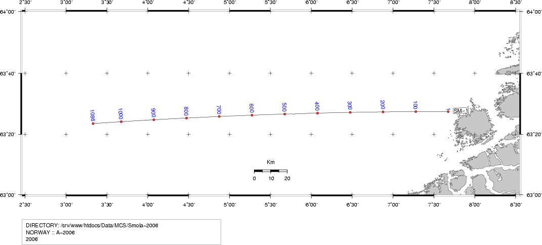 ![]() ABOUT THE SMØLA-2006 SURVEYThe Smøla-2006 survey was conducted 24/25 October 2006. RV "Håkon Mosby" was acting as source vessel for a land survey. Unfortunately, a GPS based unit that performs accurate time stamping of shot events was left behind. Time stamps are reconstructed as described below.
