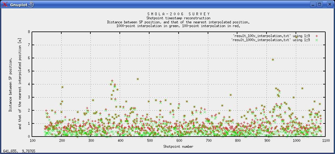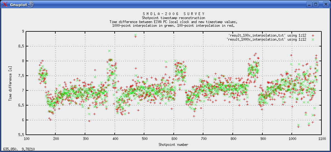APPENDIX: GNUPLOT COMMANDSset grid set xlabel "Time since midnight 24 Oct 2006 [s]" set ylabel "Latitude [decimal degrees]" set title "SMOLA-2006 Survey\nPlot of data subset - Latitude as function of time\nBoth raw data (red) and interpolated dataset (green)" plot 'time_latitude.txt' with points pt 1, 'spline-time_lat.txt' with points pt 0 set xrange [74000:76000] replot set xrange [70400:84600] replot QC-plots: set grid set xlabel "Shotpoint number" set ylabel "Distance between SP position,\n and that of the nearest interpolated position [m]" set title "S M O L A - 2 0 0 6 S U R V E Y\nShotpoint timestamp reconstruction\nDistance between SP position, \\ and that of the nearest interpolated position.\n1000-point interpolation in green, 100-point interpolation in red." plot 'result_100x_interpolation.txt' using 1:9 with points lt 1, 'result_1000x_interpolation.txt' using 1:9 with points lt 2 set ylabel "Time difference [s]" set title ""S M O L A - 2 0 0 6 S U R V E Y\nShotpoint timestamp reconstruction\nTime difference between EIVA PC local clock and new timestamp values" plot 'result_100x_interpolation.txt' using 1:12 with points lt 1, 'result_1000x_interpolation.txt' using 1:12 with points lt 2 replot |