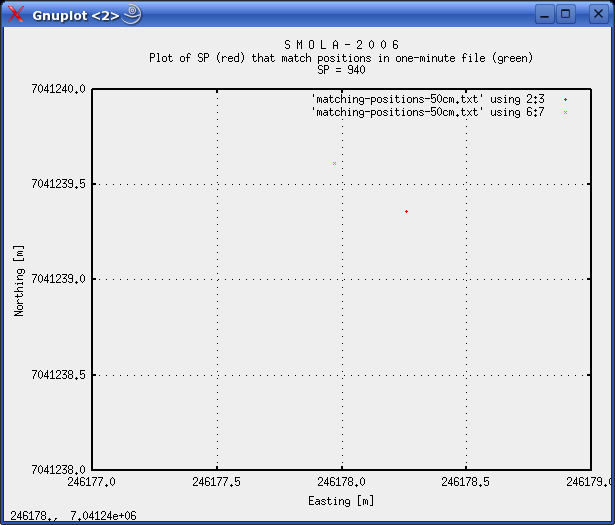 000196 394979.08 7038165.61 2006-10-24 14:50:16.843000 394979.66 7038165.86 2006-10-24 14:50:09.970000 0.63 0:00:06.873000 000249 384384.46 7038386.68 2006-10-24 15:54:17.406000 384383.57 7038386.62 2006-10-24 15:54:10.740000 0.89 0:00:06.666000 000298 374588.65 7038593.12 2006-10-24 16:53:17.703000 374588.79 7038592.71 2006-10-24 16:53:10.540000 0.43 0:00:07.163000 000552 323799.10 7039643.70 2006-10-24 22:36:17.734000 323799.90 7039643.77 2006-10-24 22:36:10.340000 0.80 0:00:07.394000 000847 264787.21 7040850.75 2006-10-25 04:44:18.359000 264787.56 7040850.79 2006-10-25 04:44:11.050000 0.35 0:00:07.309000 000888 256583.92 7041035.54 2006-10-25 05:36:17.718000 256584.06 7041034.83 2006-10-25 05:36:10.870000 0.72 0:00:06.848000 000940 246178.26 7041239.36 2006-10-25 06:45:17.703000 246177.97 7041239.61 2006-10-25 06:45:10.630000 0.38 0:00:07.073000 001002 233770.89 7041492.60 2006-10-25 08:10:18.859000 233771.59 7041492.38 2006-10-25 08:10:11.330000 0.73 0:00:07.529000 001031 227967.15 7041621.67 2006-10-25 08:51:18.203000 227966.31 7041621.58 2006-10-25 08:51:11.190000 0.84 0:00:07.013000 A 0.5 m distance limit yields these matches: 000298 374588.65 7038593.12 2006-10-24 16:53:17.703000 374588.79 7038592.71 2006-10-24 16:53:10.540000 0.43 0:00:07.163000 000847 264787.21 7040850.75 2006-10-25 04:44:18.359000 264787.56 7040850.79 2006-10-25 04:44:11.050000 0.35 0:00:07.309000 000940 246178.26 7041239.36 2006-10-25 06:45:17.703000 246177.97 7041239.61 2006-10-25 06:45:10.630000 0.38 0:00:07.073000 Of the last three matches that are within 0.5 m, we have time deltas of 7.163, 7.309 and 7.073 s. As a further aid in determining the time difference, we plot these three shotpoints, together with corresponding positions from one-minute file: ![]() Fig. 7: Plot of SP=298, and corresponding position in one-minute file. DeltaD: 0.43 m, DeltaT: 7.163 s. ![]() Fig. 8: Plot of SP=847, and corresponding position in one-minute file. DeltaD: 0.35 m, DeltaT: 7.309 s. ![]() Fig. 9: Plot of SP=940, and corresponding position in one-minute file. DeltaD: 0.38 m, Delta t = 7.073 s. There is an important observation to be made. In fig. 7 and 8, the shotpoint occurs AFTER the corresponding one-minute position, while in fig. 9, it occurs BEFORE the one-minute position. This is because the line was traversed from EAST to WEST. So in the latter case, the time difference should be SMALLER then in the two first cases - and this is supported by the data. So the true time delay should be between 7.073 and a time represented by the two other figures - 7.309 and 7.163 s. For the moment, let's concentrate on shotpoint pairs 847 and 940 that are near symmetrical on either side of corresponding one-minute positions. They are only two hours apart, so drift in Eiva local clock should be minimal. For SP=847 we have 0.35m/7.309s, and for SP=940 we have 0.38m/7.073s. To strengthen our argument, let's calculate how long it takes to travel 0.35 and 0.38 m, assuming ship's speed was 5 kt (2.57 m/s):