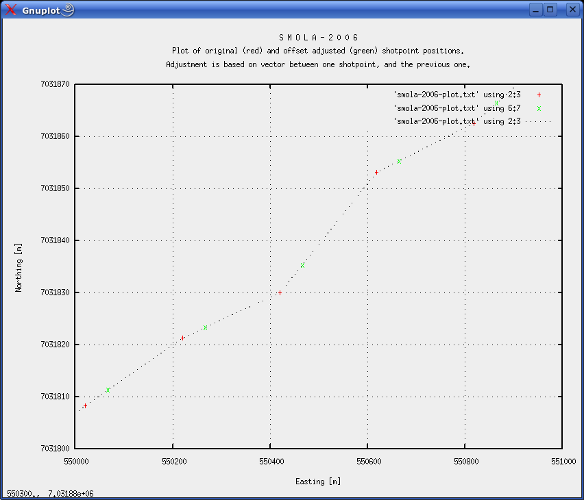 The output files are here: Plot of original (red) and adjusted (green) shotpoint positions illustrates how the vector based offset method works. A spline interpolation is probably more appropriate, but the increased precision is not deemed necessary. The vector based method is simple - spline interpolation requires a lot more programming effort, and the gain is marginal ... ![]() Fig. 12: Plot of original (red) and offset adjusted (green) shotpoint positions, illustrating the effect of vector based offset method.