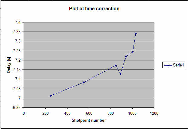 Time @ 5 kt: 1/(1852*5/3600) * Delta distance. Add/subtract: If SP Easting is lower then one-min Easting, SP occurred AFTER one-min position. In that case, add. Note 1): Position mainly changes in N-S direction. Discard. The figures in the "Result" column suggest that there is a slight drift in the Eiva local clock during the time the line was shot. We could linearly apply 6.95 s correction for the first SP, and 7.30 for the last. This yields 0.35 s drift during the 24 hours it took to shoot the line. The drift in time adjustment values can be seen in the figure below. ![]() Fig. 11: Plot of time correction as function of shotpoint. Disregarding outliers at SP=888 and 1031, and placing a straight line through the remaining points, one should have 6.95 s correction at SP=1 and 7.3 s correction at the last SP.