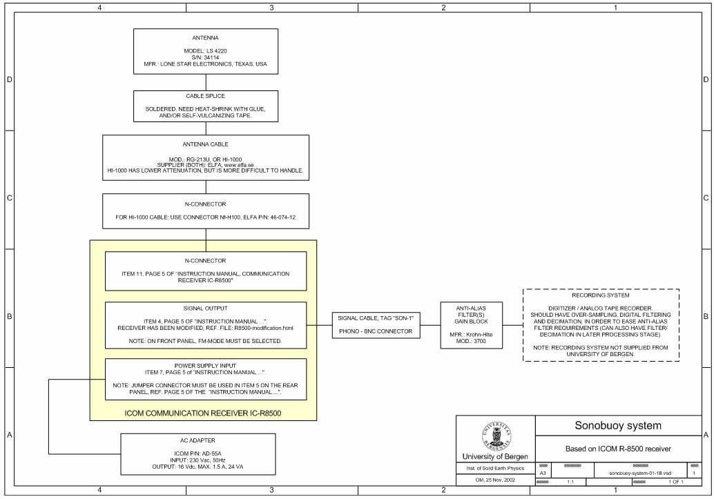 Modified according to this diagram. Icom IC-PCR1500We purchased a sonobuoy radio receiver from Greeneridge Sciences, Inc.. It was a modified Icom IC-PCR1500. WinradioANTI-ALIAS FILTERAn anti-alias filter is needed to remove or reduce input signal frequency components that are above the Nyquist frequency (½ of the sampling frequency). If the A/D-converter has N number of bits, it's dynamic range R is then given by 20*log*2N dB = R dB. From a 'purist' view all frequency components above Nyquist should be attenuated by min. R dB, burying them below the noise floor. The number of decades A between the filter cut-off frequency (-3dB) and the Nyquist frequency is given by:
