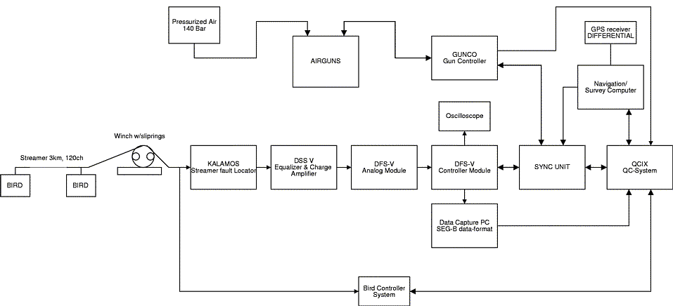 System diagramA block diagram of the analog streamer instrumentation system is shown below: ![]() Keeping vertical positionIn order to control streamer depth, it it furnished with depth control devices at regular intervals. These devices have two horizontal fins whose angle of attack relative to the water flow can be varied. This creates vertical forces - much like the elevators on an airplane. The depth control units, called "Birds", number eight in total. They are clamped on to the streamer at regular intervals during streamer deployment. After being remotely programmed to keep a certain depth they act autonomously. By altering the fin angle the bird seeks to reduce any deviation from the set target depth, continuously being questioned by the Bird Controller System to report the result of its efforts We are using Mod. 5010 DigiBIRD, manufactured by DigiCOURSE (later aquired by INPUT/OUTPUT, INC.). The Kalamos Fault LocatorThe danger of seawater intrusion, either into streamer connectors or into the streamer body, is always present. Seawater acts as an electrical conductor. It may cause shorts or electrical leakage between conductor pairs, or across pairs. The Kalamos Fault Locator is an aid in pinpointing the exact leakage location. The Kalamos is still in use. Time sequence![]() The sequence of events taking place during recording of streamer data is shown below. Time is on the vertical axis. Hydrophone group configurationDiagram for 12,5 m group: ![]() Data for 12,5 m group: