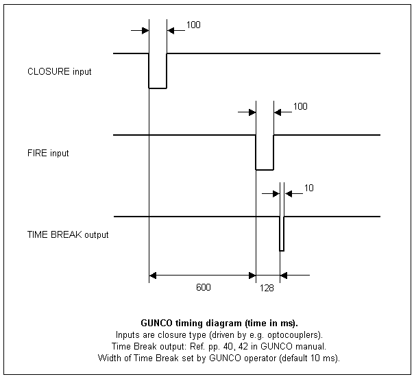 ![]() 1. TIMING DIAGRAMClosure signals on two BNC inputs will fire the GUNCO. Time Break output is available on two output BNCs; one (denoted "FTB Recording") is configurable via jumper plug on OEP-Board, the other (denoted "FTP Scope") is TTL, active low, of 10 ms duration (can be changed via GUNCO menus). ![]() GUN Controller timing diagram. Note: Delay between Closure and Fire leading edge (600 ms shown) is conservative, can probably be reduced to 250 ms (check!)