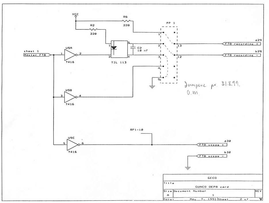 2. FTB OUTPUT SCHEMATICSFTB = Field Time Break ![]() GUNCO FTB output schematics. NOTE: As of september 2001 the jumper setting on PP! is 2-13 and 3-12.