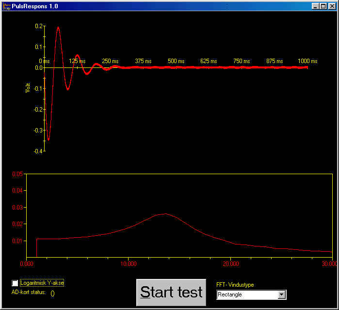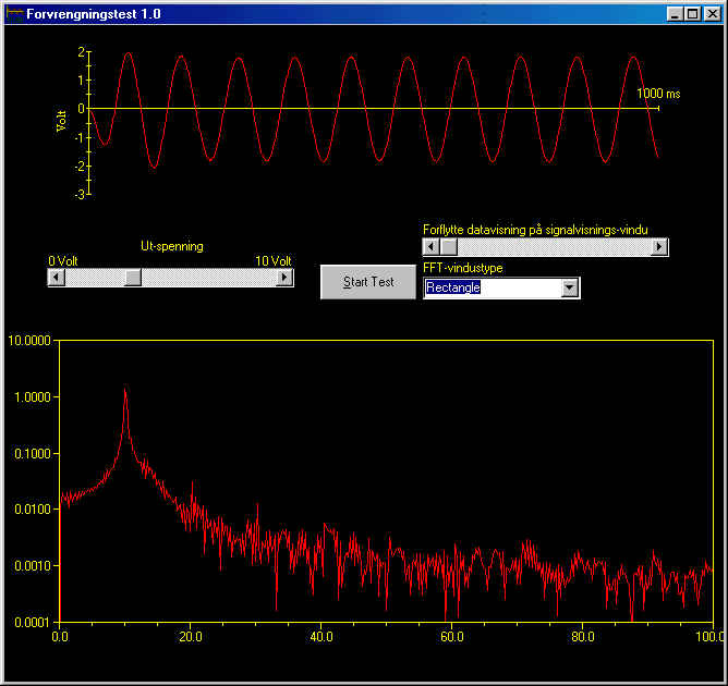 I det videre arbeidet med dette testutstyret vil vi nok flytte målefrekvensen noe høyere slik at vi fjerner oss fra systemets egenfrekvens på ca. 13 Hz, ref. fig. 2. 10 Hz er også et uheldig valg med tanke på at forstyrrelser fra nettfrekvensen (50 Hz) da blir inkludert i beregningene av THD. Vi vil også se på gjennomsnitt av flere spektra for å kunne presse "støygulvet" nedover.