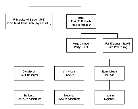 This chapter contains information on the organisations involved in the operations. This information is published by means of organograms showing UNIS and sub functions in the operation of the survey(s). All relevant names, addresses, telephone, Telefax, E-mail and telex numbers are contained in this chapter.