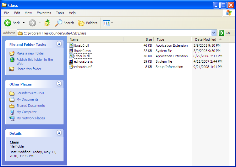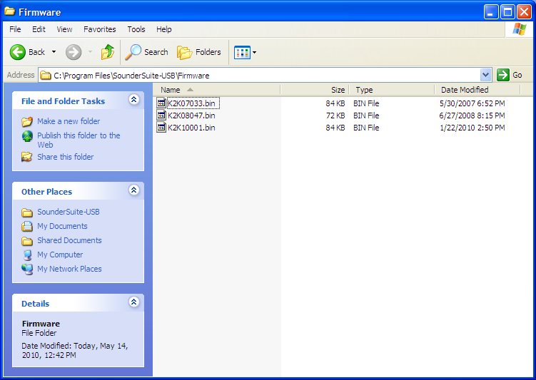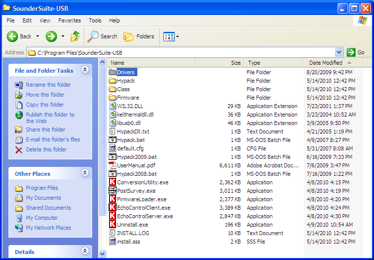 SOFTWARE VERSIONSAs of 21 April 2010![]() ![]() Update, as of 14 May 2010Installed SounderSetup.exe received from Knudsen Engineering (email attachment, 28 April 2010, ref. D.C.). Setup type: Local-Machine At the moment the PC running the SounderSuite software is separated from the Chirp hardware, so we cannot verify proper operation. Instead, here are screenshots of SounderSuite directories ....