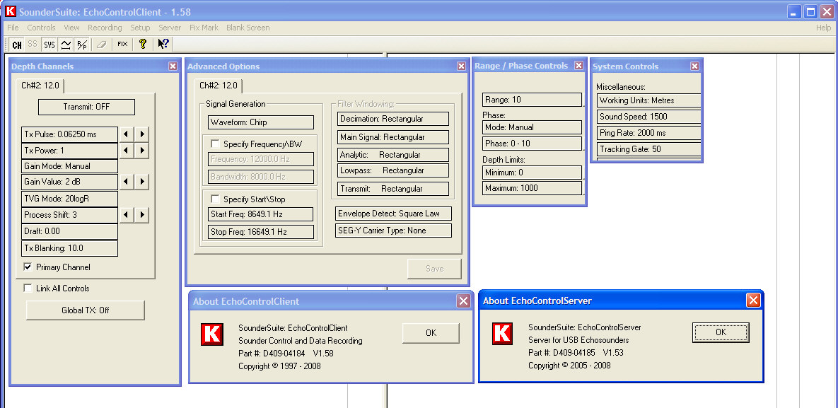 Update, as of 24 June 2010We installed new version of Knudsen Sounder Suite, and performed the firmware upgrade. Status message after firmware upgrade: ![]() Knudsen firmware, status as of 24 June 2010. All modules have the same version number: 2.14. Email correspondence with manufacturer:Question, 24 June 2010: ---------------------- We are updating both Chirp 3200 Firmware and Sounder Suite software. There was only one firmware bin-file (K2K10001.bin) included in the new Sounder Suite install program, and we used this file for all three channels. When we start the Echo Control Client, all three channels show up as "50 kHz" - see attached screenshot. That cannot be correct. Reply, same day: You will need to reset your factory defaults. In the EchoControl Client program, go to Setup/Factory Defaults.../EchoSounder Controls. You will get a message box asking you to confirm. Click Yes and the software will retrieve the correct settings from the sounder boards. DATA FORMATS - SOME PITFALLSData from chirp sub-bottom profilers can be recorded in different formats. Here's an article and some notes by Paul Henkart that shed light on this subject: |