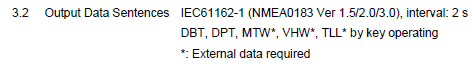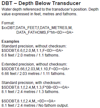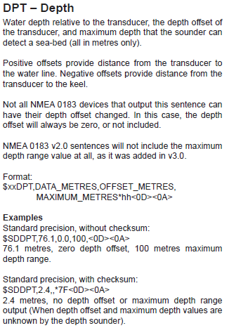 As we are only interested in depth information, we have to consider these two telegram types: DBT and DPT telegram formatsExcerpt from page 13 of NMEA 0183 Information sheet: