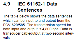 Example data outputThe FURUNO FCV-620 Echo Sounder can be set to simulator mode. We captured some serial data when the instrument was in simulator mode: $SDDPT, 18.43, 0.00*69 $SDDBT, 60.46,f, 18.43,M, 10.07,F*0A $YCMTW, 9.40,C*04 $VWVHW,,T,,M, 18.20,N,,K*51 $SDDPT, 16.75, 0.00*62 $SDDBT, 54.95,f, 16.75,M, 9.15,F*13 $YCMTW, 9.36,C*05 $VWVHW,,T,,M, 18.40,N,,K*57 $SDDPT, 15.07, 0.00*64 $SDDBT, 49.44,f, 15.07,M, 8.24,F*16 $YCMTW, 9.38,C*0B $VWVHW,,T,,M, 18.60,N,,K*55 $SDDPT, 13.22, 0.00*65 $SDDBT, 43.37,f, 13.22,M, 7.22,F*10 $YCMTW, 9.47,C*03 $VWVHW,,T,,M, 18.80,N,,K*5B $SDDPT, 12.34, 0.00*63 $SDDBT, 40.48,f, 12.34,M, 6.74,F*1F $YCMTW, 9.45,C*01 $VWVHW,,T,,M, 19.00,N,,K*52 $SDDPT, 12.46, 0.00*66 $SDDBT, 40.87,f, 12.46,M, 6.81,F*13 $YCMTW, 9.53,C*06 $VWVHW,,T,,M, 19.20,N,,K*50