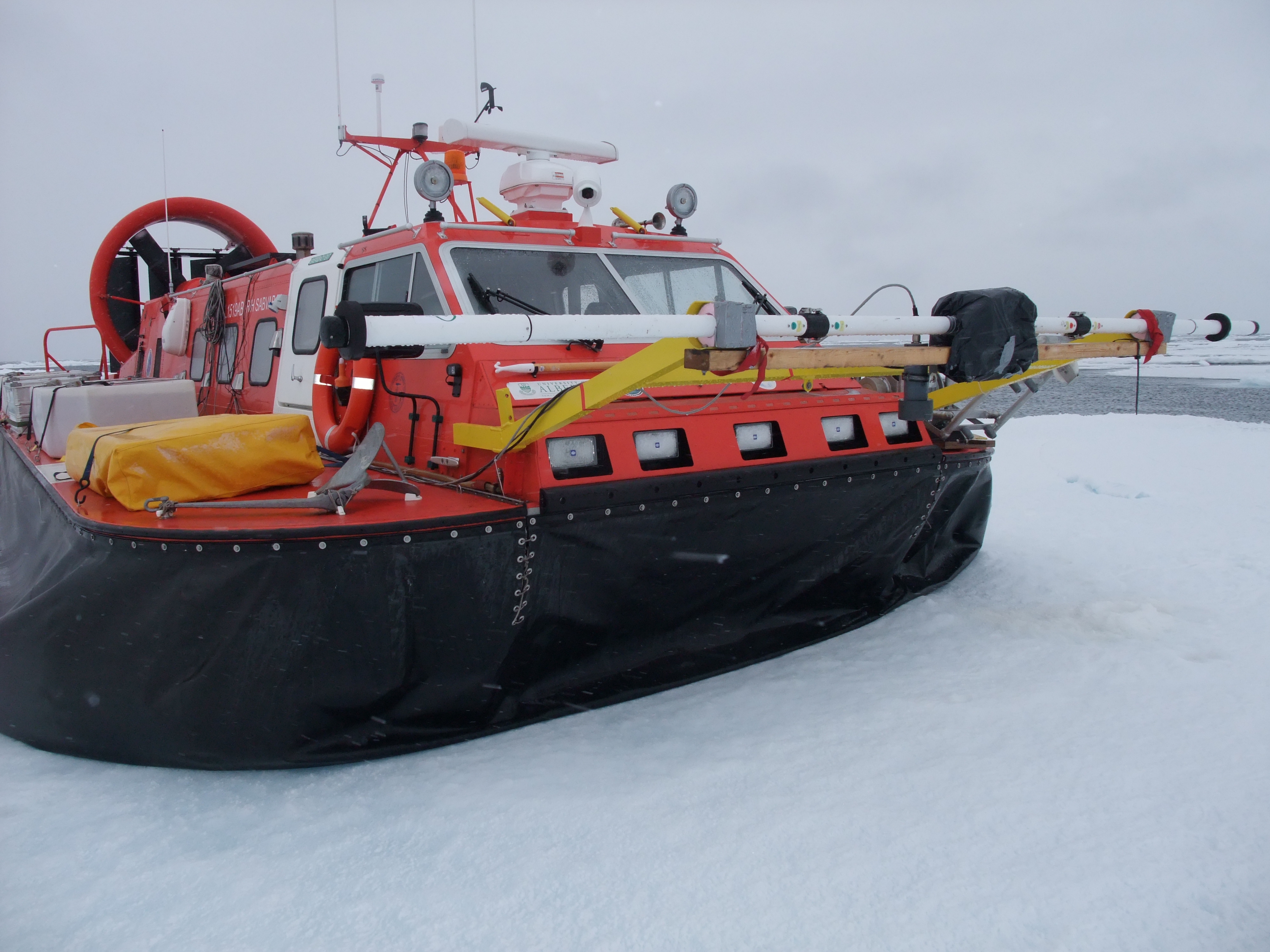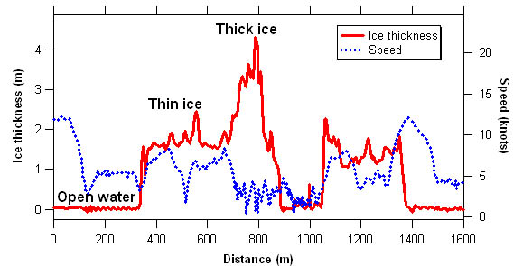 ICE THICKNESS MEASUREMENTSIntroduction: Electromagnetic (EM) ice thickness measurementsEM sounding is a classical geophysical method to study the conductivity structure of the underground. In the case of sea ice thickness measurements, the method takes advantage of the fact that sea ice is highly resistive (almost as resistive as air), while the sea water underneath is very conductive. Therefore, the depth of the ice-water interface can be very accurately determined. An EM sensor does not require any physical contact with the underground. Therefore it can be operated from any moving platform (like a sledge, a helicopter, an airship, or a hovercraft). As the EM instrument determines the height of the sensor above the ice/water-interface, a laser or sonic distance meter is used to measure the height above the snow surface. The difference between both measurements is the snow-plus-ice thickness. The EM ice thickness measurement method is described in Evaluation of ship-based electromagnetic-inductive thickness measurements of summer sea-ice in the Bellingshausen and Amundsen Seas, Antarctica by Dr. Christian Haas. Instruments used are a Geonics EM31-MK2 conductivity meter manufactured by Geonics, and a Microsonic mic-601/IU/HV/M30 sonic distance meter.