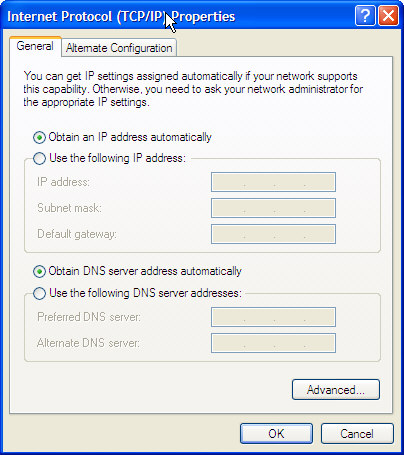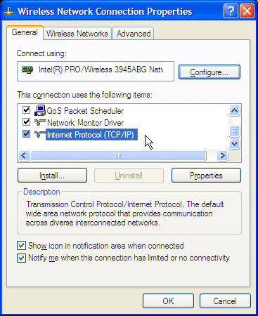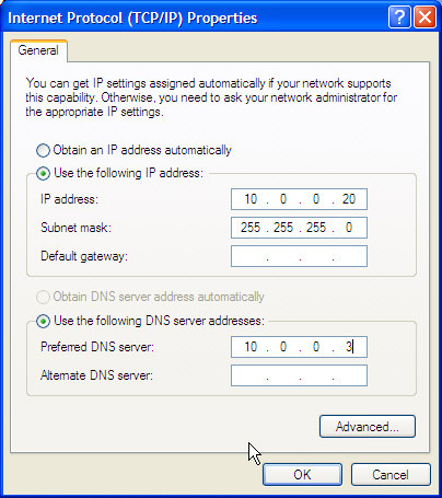 Assign static IP WLAN address to Laptop no. 1 => INTERNET GATEWAYThis machine will act as Gateway to the internet. We will assign a static IP addresss of 10.0.20 to it's WLAN interface. Go into START -> CONTROL PANEL -> NETWORK CONNECTIONS and identify the icon that belongs to the WLAN. Right-click this icon, select PROPERTIES, scroll down to INTERNET PROTOCOL, select it and click PROPERTIES: ![]() Now you will see: ![]() In this case it's configured for DHCP-usage. Let's set it to the IP address we selected, and also set SUBNET MASK as shown: You can leave the other fields blank. Click OK. ![]() Assign IP to Laptop no. 2 - MAP MACHINEGo into and identify the icon that belongs to the WLAN. Right-click this icon, select PROPERTIES, scroll down to INTERNET PROTOCOL, select it and click PROPERTIES. Laptop no 2 IP address is set to 10.0.0.10 Subnet mask to 255.255.255.0 Default gateway: 10.0.0.20 (this is the machine with Mobile Broadbard) Set DNS servers - according to numbers found in terminal windows on Gateway Now open terminal window and: ping 10.0.0.20 (you ping the gateway) ping www.startsiden.no (you ping a server on the internet) If you manage to ping a machine on the internet like this, you're in business!! Assign IP to Laptop no. 3 & 4Follow same procedure as in section above - only use a different IP address.