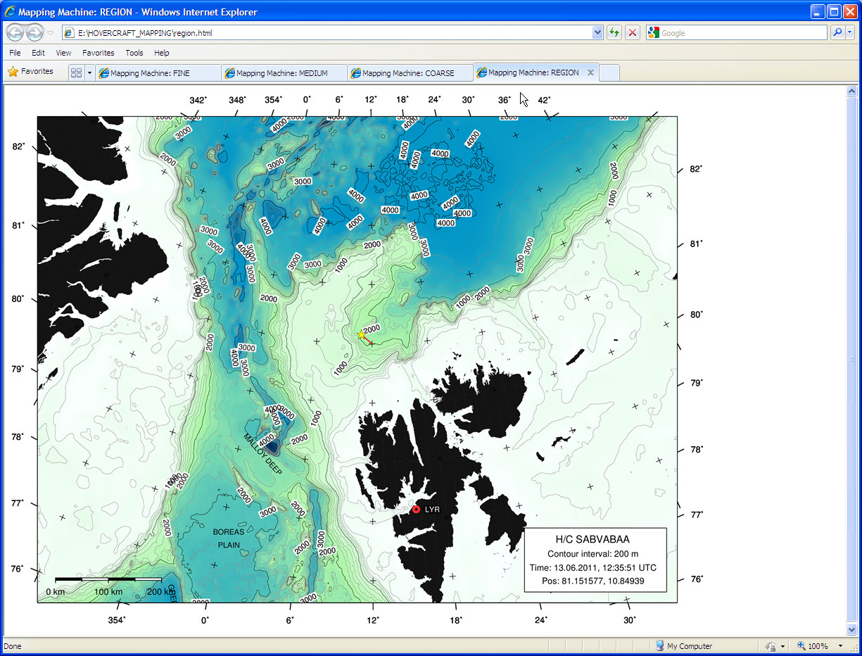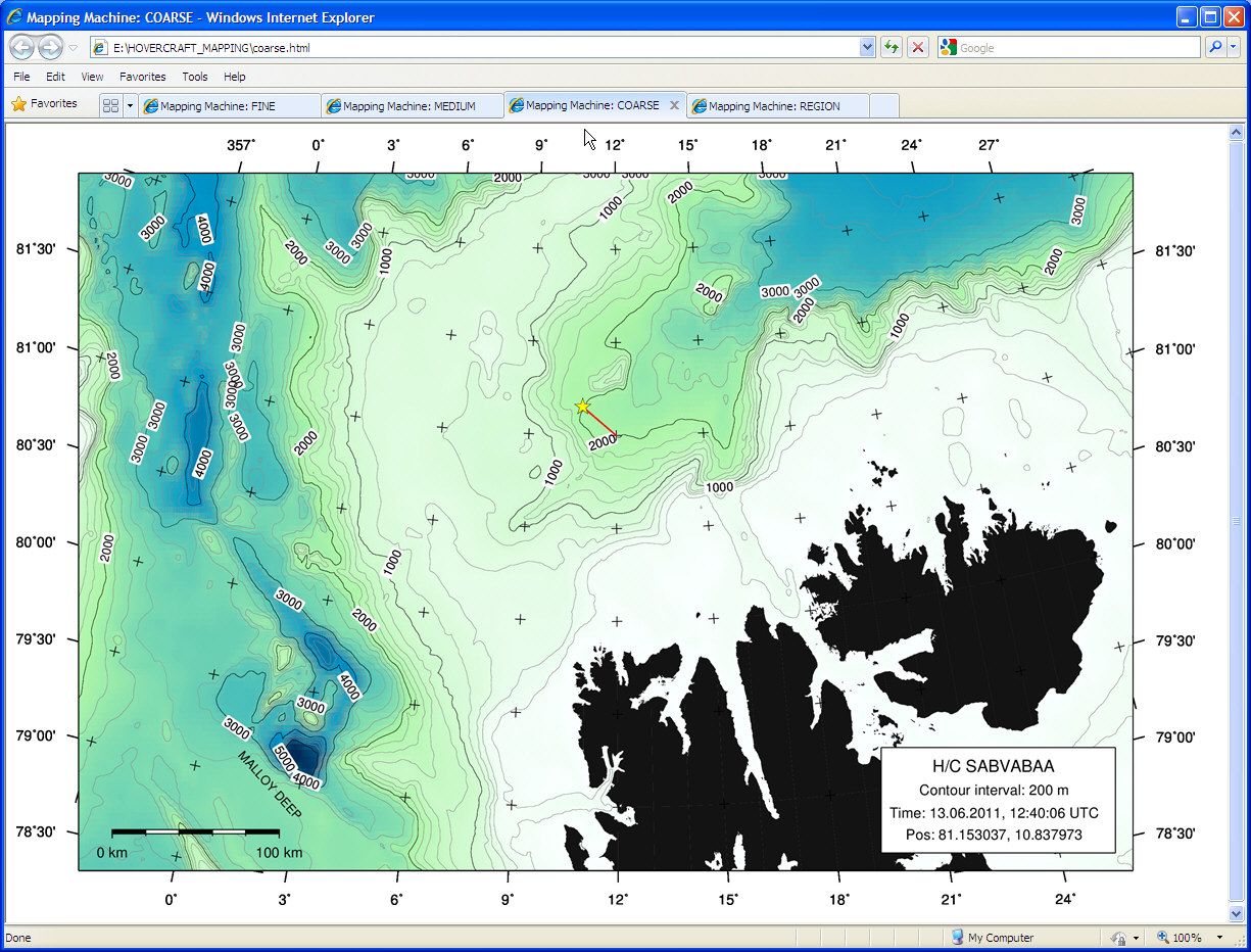 MAP MACHINEINTRODUCTIONThe Map Machine reads GPS data from vessel network and uses Generic Mapping Tools (GMT) and the IBCAO bathy data set to produce maps in four resolutions at regular intervals. The maps track vessel position. In addition, the map machine program saves track data to file every 30 seconds. ![]() INSTALLATIONRequired programs