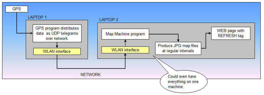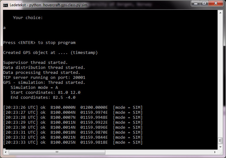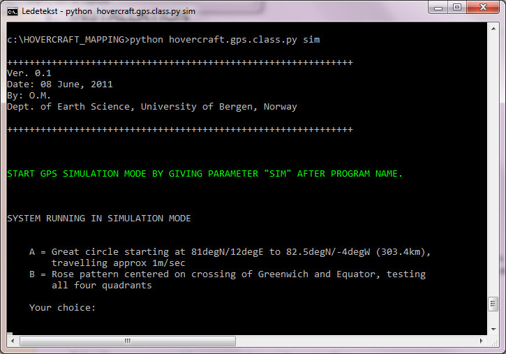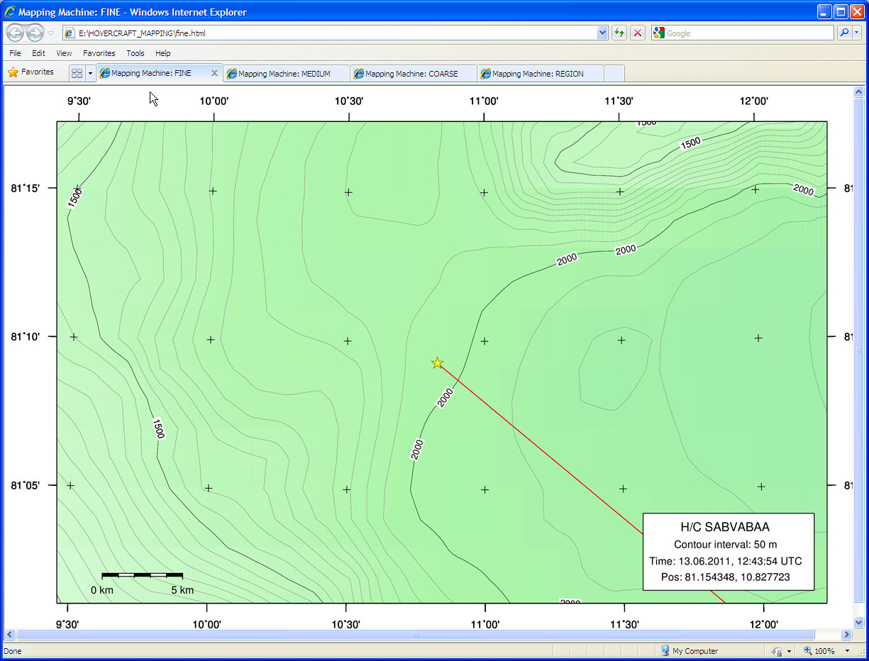 SOFTWARE DESIGNMapping software depend, of course, on GPS input. In our case, a separate program reads GPS data from USB or serial port, converts data into another format and transmits data as an UDP telegram over vessel network. The GPS program and mapping software can reside on the same computer, or on different computers - there is no need for configuration as the UDP telegrams are sent in broadcast mode, reaching all machines on the network. Telegrams from the GPS program can be used by different programs that all share a need for time- and navigation input. ![]() Map machine software structure (diagram Excel file). OPERATIONStart GPS simulator, for testingTest first mapping software by starting a GPS simulator. Open terminal window, cd to C:\HOVERCRAFT_MAPPING, and issue the command: python hovercraft.gps.class.py sim You should see: ![]() Select option A. The program then starts transmitting UDP broadcast telegrams: ![]() Start mapping softwareOpen new terminal window, cd to C:\HOVERCRAFT_MAPPING, and issue the command: python make-maps-zoomlevels.py The program will first create four maps from the ground up - a time consuming process; approx 1 minute per map. When the program redraws map later on, it operates on the top layer of the map, only updating current position and trackline (maps are produced in PostScript, building layer upon layer, and converted to JPG in the end). After a while, the mapping software enters normal mode. The interval between map regeneration is determined by settings in INI-file. There are two types of map regeneration: a) Only current position and trackline, and b) complete map. The interval between partial redraw is set in INI file. The interval between complete redraw is guided by the need to keep vessel in map center (more or less); the redraw threshold (in km) is set in INI file, and the vessel speed will of course determine how fast this threshold is reached. Next, open IE web browser. Startpage is set to show the four maps in separate tabs. Map with FINE resolution has shortest update interval (ref INI file). FIRST VERSION: OBSOLETE - KEPT FOR REFERENCEScreenshot below shows the first version of a combined map machine and instrument integration application, using a standard browser as user interface. A JavaScript library called JQuery was employed in developing this interface. Unfortunately, this library had a severe memory leak problem, causing the application to run very slowly after a couple of hours. It was uncertain if the leakage problem could be solved at all, so we had to switch to plan B ... ![]() |
