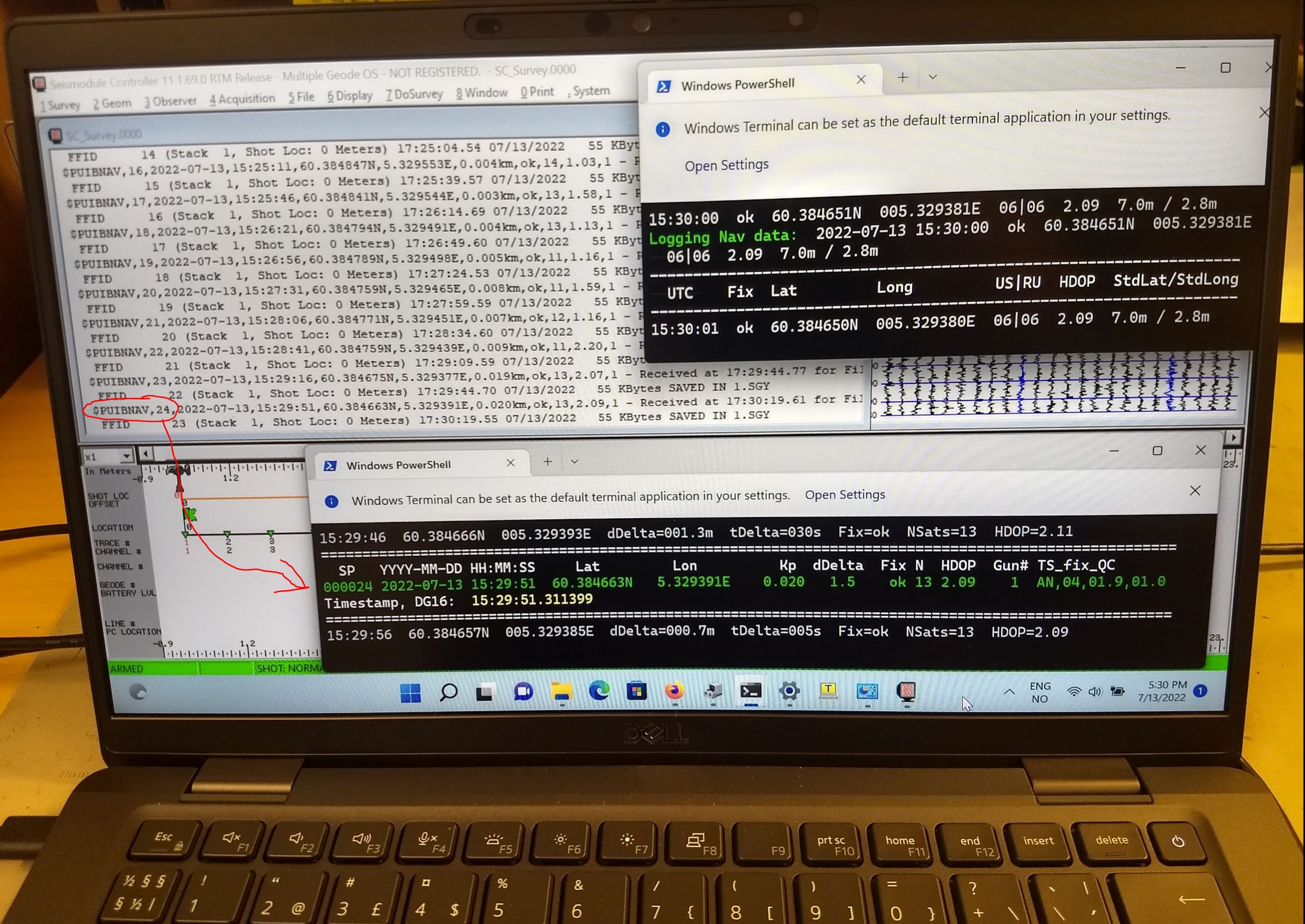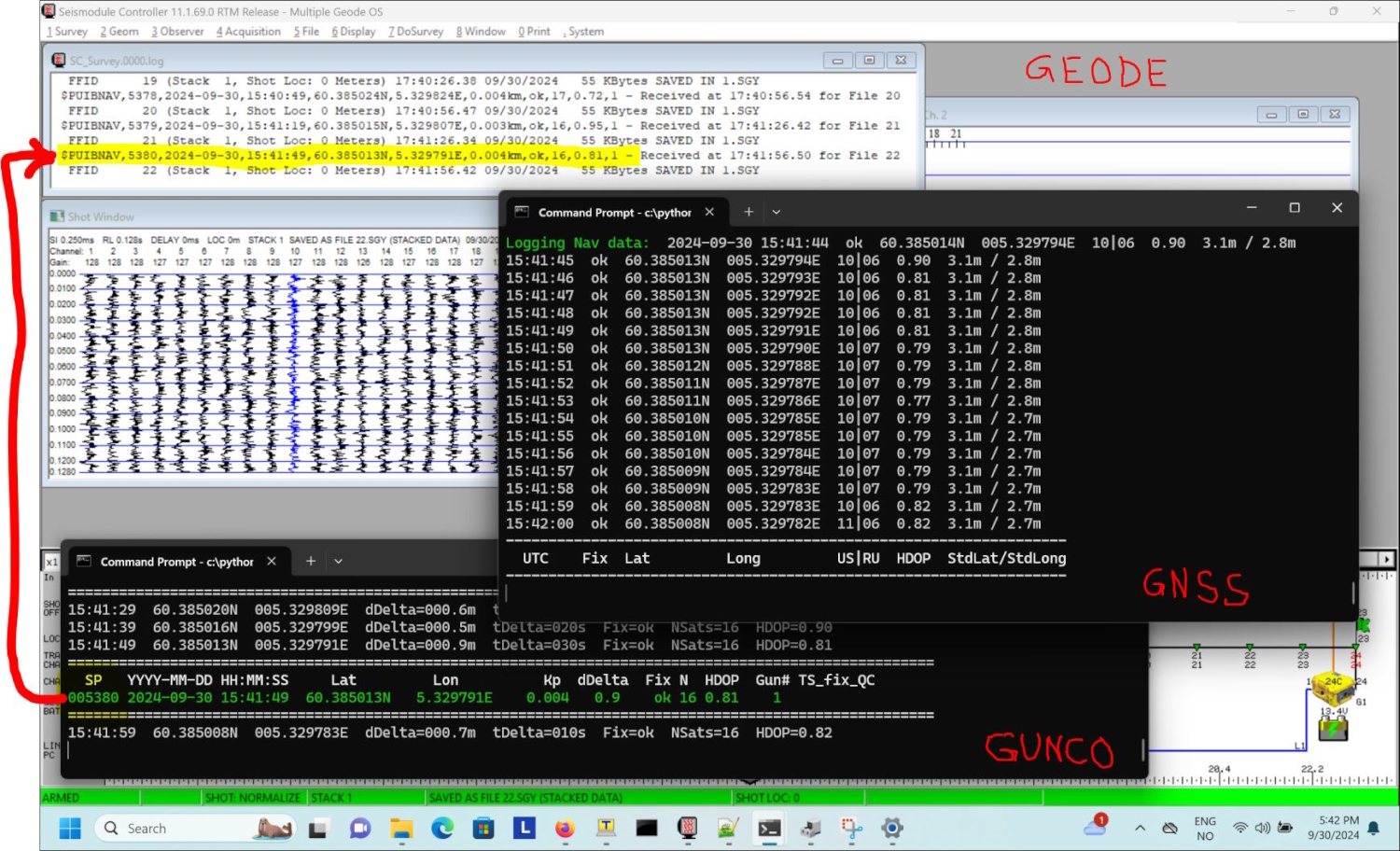 13 July, 2022: Three programs operating on WIN11 laptop: (a) GNSS Distributor/Survey logger; (b) Mini-GUNCO program; (c) GEODE program. Red arrow marks how Mini-Gunco program exports serial RS232 Shotpoint event data, which are captured by GEODE program (using separate COM-port). The event data string looks like NMEA telegram, starting with "$PUIBNAV", where means P="Proprietary", UIB="Universitetet i Bergen", and NAV="Navigation data". Click to enlarge.
